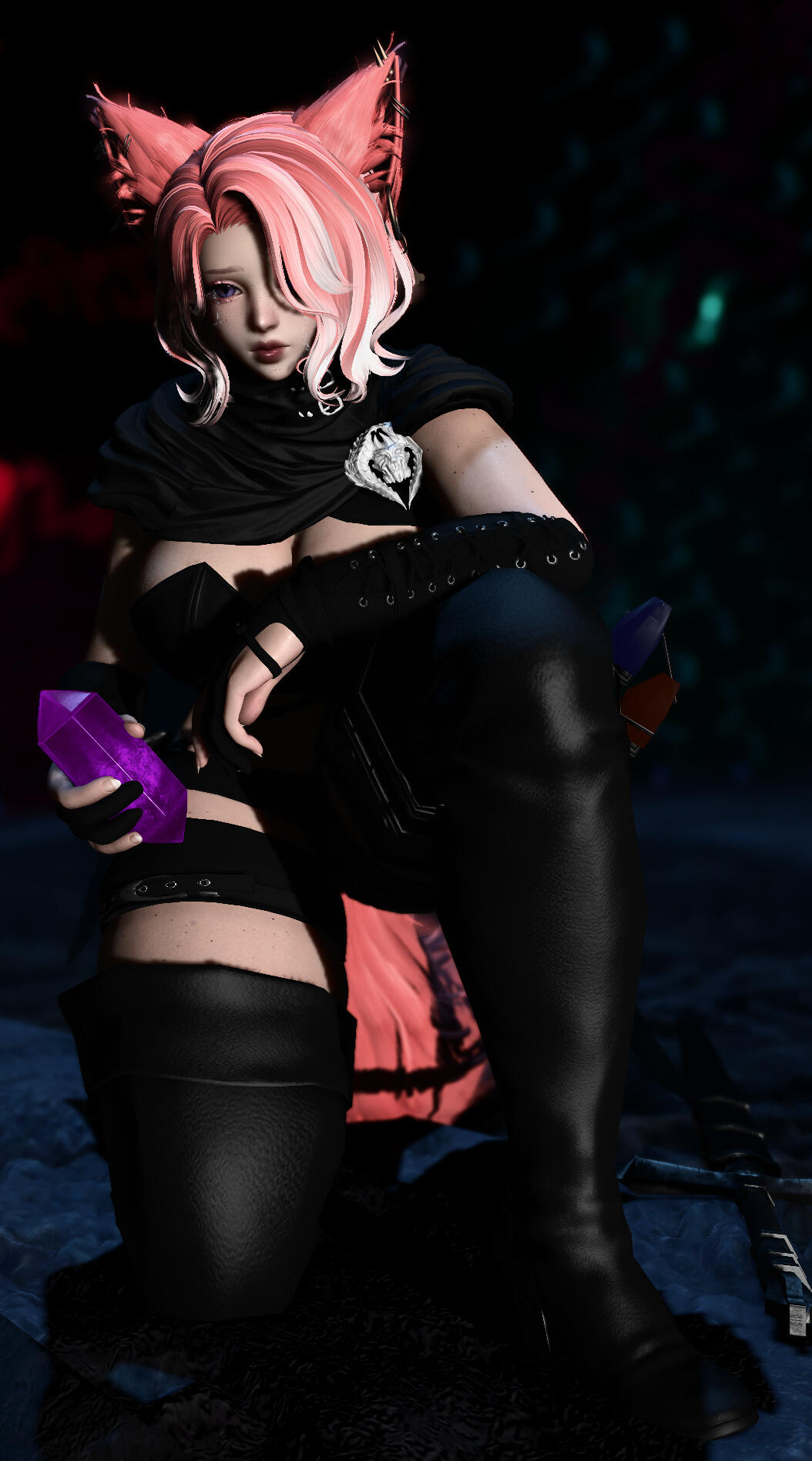 Era's later when the cities seals had fallen a certain WoL on a mission to clear out the now un hidden city found this strange miqote in the more inner areas unconscious. He and his friends of course rescued her, defeated the voidsent Diablo and brought her back to the scions for aid.She awoke with their help but her memories were in tatters... she could barely remember her (the original bodies) name Ellehazdra. She would be haunted by nightmares and flashes of memories over time piecing together roughly what she was and had done... this almost ruined her and to top it all off her body seemed to no longer age so she was stuck with this burden. The scions helped her thru this time with the WoL becoming her best friend and a rock to support her. She in turn turned her focus to helping her new friends and while the body's original owner was not a WoL or skilled in combat the main soul of the voidsent had been a WoL of the thirteenth, a talented one born who was born too late to stop the ultimate destruction of her shard and doomed to turn into what she had fought against. Thus she progressed quickly in all combat arts she picked up and was soon aiding her friends in their endeavors one of which would finally put the original soul of Ellehazdra to rest.Upon accompanying the WoL aboard an ancient Mhaching Airship called the Void Ark they discovered Echidna, the voidsent who contained what was left of that lost miqote. There was no trace of that girl left however, she had fully become what she had hated, losing all memories of her past life and devouring many a more voidsent to grow strong. With a heavy heart Ellehazdra aided in putting the tortured soul to rest, releasing her from the foul chains she had damned her so many eras ago and as her fell body faded she fell to her knees sobbing both for what she had done and for the release of that poor soul.
